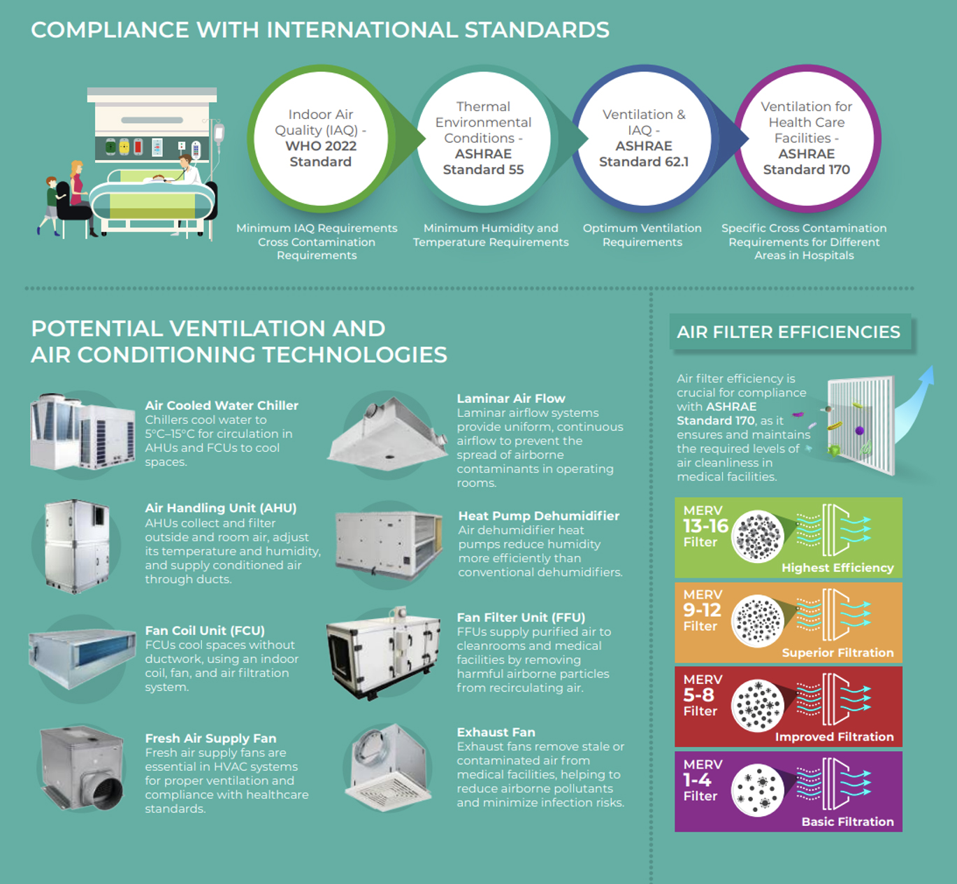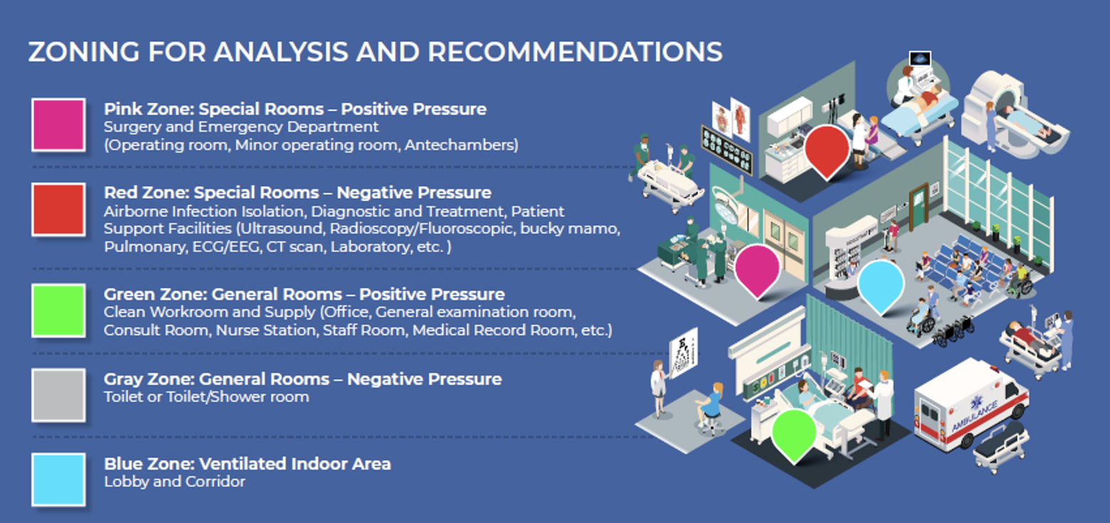 Introduction Disruptions to global supply routes have exposed Asia’s dependency on imported fuel and how quickly that dependence translates into pressure on public budgets and essential services. Governments are ordering cuts across public institutions, including hospitals. But unlike offices, schools, and other public agencies, hospitals cannot reduce hours, send staff home, or dim the lights. They run 24 hours a day, 7 days a week, caring for patients who cannot wait. In practice, hospitals are designed to stay operational when it matters most, with reliable energy supply, proper ventilation and air filtration, and safe water and waste management that can keep functioning when external systems fail. In hospitals, energy, health, and indoor air quality are all interlinked with essential air conditioning and ventilation, typically accounting for at least 50%–60% of energy consumption in large facilities. A hospital that generates its own energy and uses it efficiently is not only greener, but it is safer, more affordable to operate, and more resilient when people need it most. Why does air quality matter so much more in hospitals than in other buildings? Hospitals are not ordinary buildings. They are places where infectious diseases are diagnosed and treated, and where immunocompromised patients share enclosed spaces with staff and visitors. The COVID-19 pandemic made it clear that inadequate ventilation systems can become highways for the airborne spread of pathogens. Viruses can survive in the air for several hours in aerosols, with droplet transmission facilitated by poorly managed air-conditioned ventilation. The next outbreak is a matter of when, not if—and hospitals that cannot control their air environments will remain unprepared for it. Hospital air must be not just comfortable, but clinically safe and pandemic-resilient. What is the ideal air circulation in a hospital? International standards set by the World Health Organization (WHO) and the American Society of Heating, Refrigerating and Air-Conditioning Engineers (ASHRAE) Standard 170 define specific requirements for hospital ventilation, including air change rates, temperature ranges, humidity levels, and filtration standards. Critically, different areas of a hospital require entirely different air environments (Figure 1). Operating rooms must maintain positive pressure for clean, filtered air that is continuously pushed outward, so that no outside air carrying potential contaminants can enter a sterile surgical field. Isolation rooms for infectious patients require negative pressure, so contaminated air is contained and cannot escape into corridors and wards. Immunocompromised patients—those on chemotherapy or awaiting transplants—require the reverse to keep pathogens out. Air filters are rated on a Minimum Efficiency Report Value (MERV) scale from 1 to 16. A higher rating indicates a greater ability to capture particles. For reference, a household air conditioner typically rates MERV 1 to 4, while hospitals require at minimum MERV 13 in high-risk areas. Split-type air conditioning units simply cannot meet this standard. Managing these zones correctly is the difference between a hospital that controls infection and one that spreads it. Figure 1: Hospital Zoning for Air Quality Management Click on image to enlarge.Note: Different hospital areas require specific pressure controls and filtration standards to ensure optimal infection control and patient safety. Pink zones (surgery and emergency departments) maintain positive pressure; red zones (isolation and diagnostic areas) use negative pressure; green zones (general rooms) have positive pressure; gray zones (utility areas) maintain negative pressure; and blue zones (public areas) focus on proper ventilation.Source: Asian Development Bank. Conceptual Design for Ventilation and Cooling Systems in Health Care Facilities. Technical Assistance 6563: Regional Support to Build Disease Resilient and Energy Efficient Centralized Air-conditioning Systems funded by the Clean Energy Financing Partnership Facility and High-Level Technology Fund. How do most hospitals in Asia handle their cooling needs? Despite clear standards, many hospitals across developing Asia continue to rely on the same split-type air conditioning units found in homes and small offices. These units lack sophisticated air filtration, cannot manage positive and negative pressure zones, and have no capability for ensuring fresh air circulation in line with WHO and ASHRAE requirements. Apart from being unsafe, these are also inefficient. Under Technical Assistance 6563, Asian Development Bank (ADB)-supported energy audits at four Philippine government hospitals found systematic inefficiencies, including systems running simultaneously to achieve minimum cooling and basic maintenance failures compounding energy waste. These findings are not unique to the Philippines; similar patterns have been observed across the region. Figure 2: International Standards and Technical Solutions for Hospital Heating, Ventilation and Air-Conditioning Systems Click on image to enlarge.Note: Modern Hospital Heating, Ventilation and Air-Conditioning systems must comply with WHO and ASHRAE standards for indoor air quality, thermal conditions, and ventilation (top panel). Meeting these standards requires deploying appropriate technologies including air handling units, chillers, filtration systems, and specialized equipment for different hospital areas. Air filter efficiency ranges from basic MERV 1–4 filters to highest efficiency MERV 13–16 filters depending on the application (bottom right panel).Source: Asian Development Bank. Conceptual Design for Ventilation and Cooling Systems in Health Care Facilities. Technical Assistance 6563: Regional Support to Build Disease Resilient and Energy Efficient Centralized Air-conditioning Systems funded by the Clean Energy Financing Partnership Facility and High-Level Technology Fund. What ar
